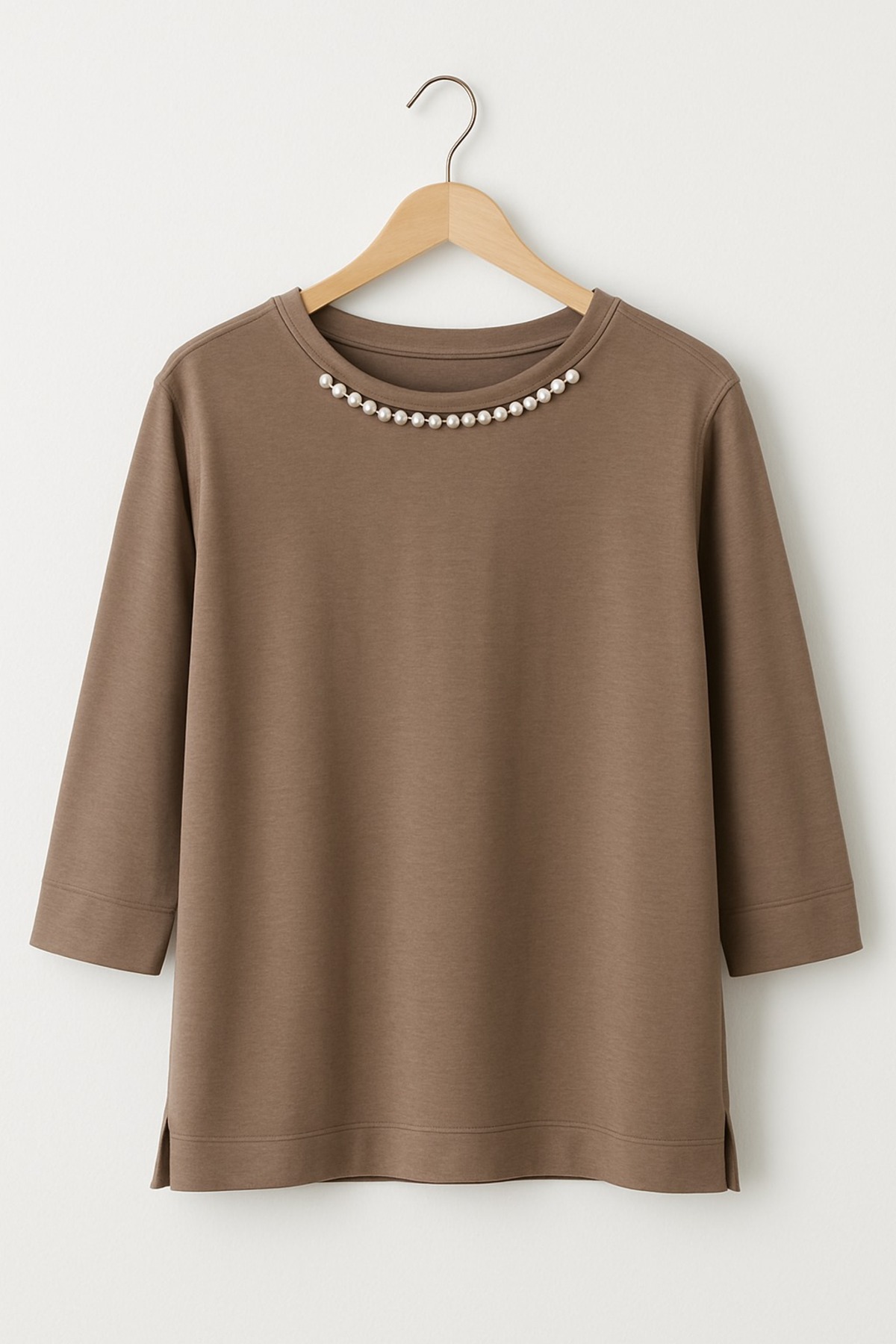 Yumuşak dokulu, regular fit bluz.; Ön yakada zarif inci detay, arkası düz.; Ofis ve günlük şıklık için ideal.; Ürün ÖzellikleriModel: Kadın bluz / üstRenk: Taupe (vizon / toprak ton)Yaka: Bisiklet yaka inci süslemeli (ön tarafta)Arka: Düz – boncuk/aksesuar yokKol: 3/4 kolKalıp: Regular/rahat kalıp; vücuda yapışmazKumaş: Yumuşak örme jersey (içerik etiketi üründe)Boy: Basen hizası; yanlarda kısa yırtmaçKullanım: Ofis, toplantı, günlük stil, davet-şık kombinlerDetaylı AçıklamaMinimal tasarımı inci yaka detayıyla birleştiren bu taupe/vizon bluz, gardırobun en çok giyilen parçalarından olmaya aday.; Rahat kalıbı ve 3/4 kolları gün boyu konfor sağlarken, ön yakadaki inci dizilimi elegan bir görünüm verir.; Arka yüzü düz olduğu için çanta askısı vb.; takılma yapmaz.; Düz renk yapısı sayesinde etek, pantolon veya jean ile kolayca kombinlenir.; Beden & Kalıp NotuKendi bedeninizi tercih edin; iki beden arasında kalanlar daha rahat bir duruş için büyük bedeni seçebilir.; Esneme payı olan örme kumaş.; Bakım TalimatlarıTersten 30°C’de hassas yıkamaAğartıcı kullanılmazDüşük ısıda ütü (inci detay üzerine direkt ısı uygulamayın)Kurutma makinesi önerilmez; düz zeminde kurutun